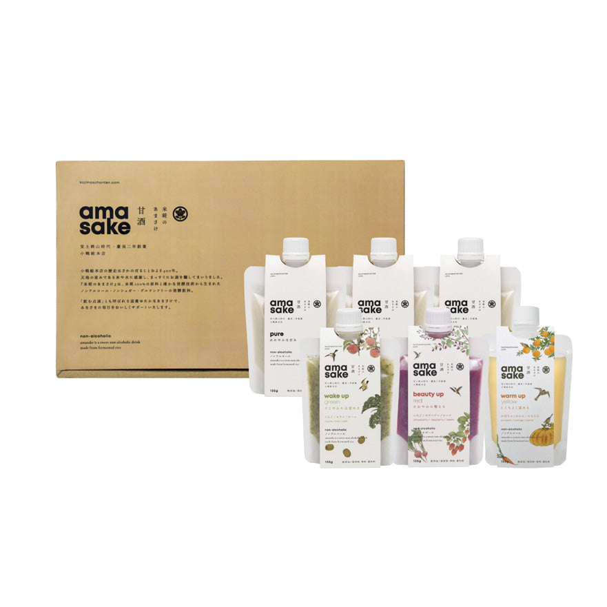 山形県産の米糀100%でつくられたあまさけ『pure』と、ビタミンとミネラルを豊富に含んだあまさけスムージー『wake up green』・『beauty up red』・『warm up yellow』をそろえた6個入りギフトセットです。