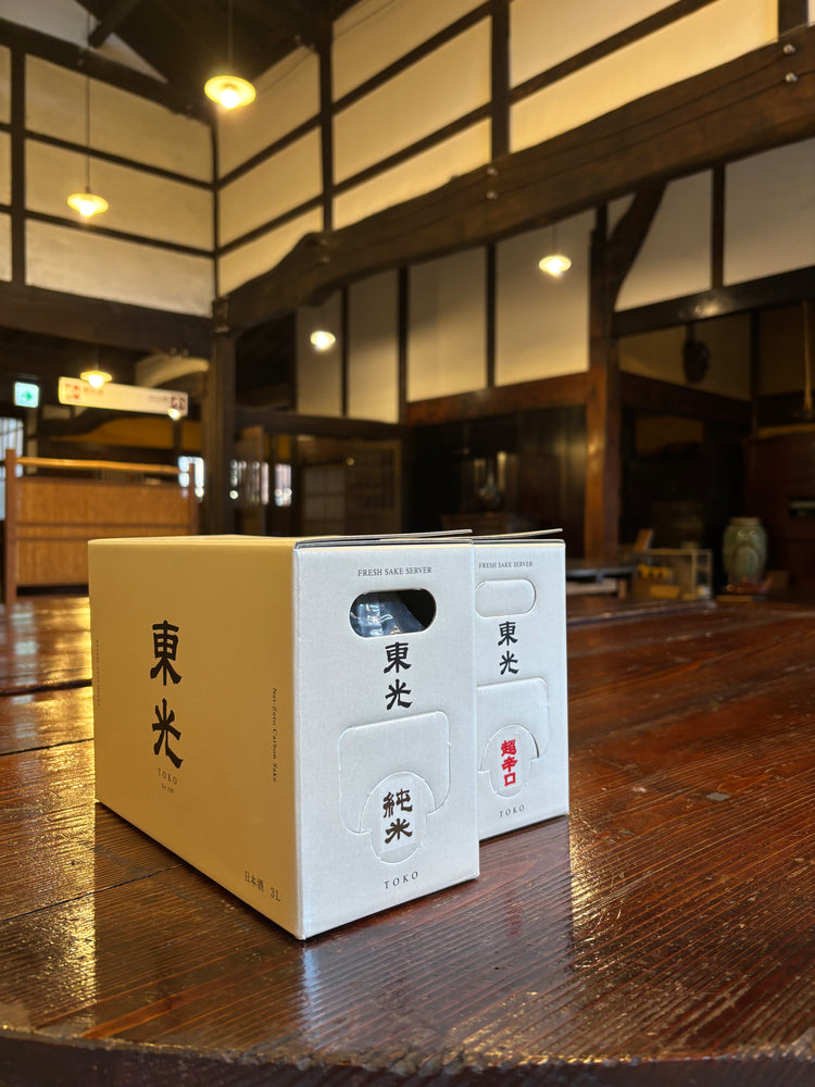 当蔵は、添加物を用いないピュアな酒造りを行うとともに、環境に配慮した持続可能な酒造りにも注力しております。ボックス型の容器はお酒が酸化しにくくフレッシュさが維持されることに加えて、近年は瓶よりも環境負荷が少ないという利点も挙げられています。
