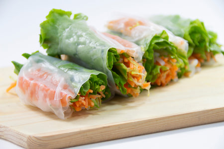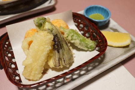 白身魚の刺身、魚介類のカルパッチョ、天ぷら、ローストビーフ、トマトのカプレーゼ、生春巻き、モッツァレラチーズ、サラダ、カットフルーツ、柑橘系のソースを使った料理